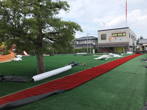 着々と芝が貼られています。パピーハウスまでの屋根もかかりました