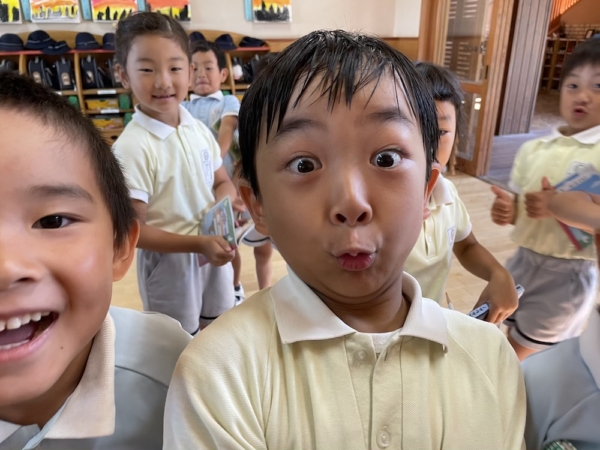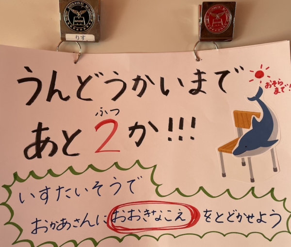 これは運動会に限らず、大きな声を出すことをわかりやすく伝える方法。2歳や年少には効果的
